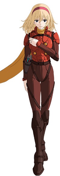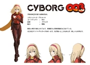 Francoise wears a redesigned 00 Cyborg uniform where from the waist up, she wears a bright red, high-collared armored vest that resembles a flak jacket, with bright red protectors on her wrists and shoulders; black shoulder and chest straps; and four yellow dots on the front of her torso. Underneath the vest, she wears a dark red bodysuit, with a thick black belt on her waist connected by four straps running parallel diagonally across her upper thighs and crotch area. Her footwear consists of black, knee-high, armored boots with built-in knee protectors, and she has black protective pads on her elbows. Her uniform has a gun holster to hold a redesigned Super Gun, and her iconic yellow scarf goes through a slit in the back of her collar.