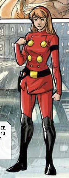 She wears a modern depiction of the classic Cyborg 00 uniform, with realistic padded shoulders, knee-high boots, and a black belt with a realistic gun holster holding a blaster. Later on in the arc, she starts to wear an upgraded uniform that consists of a red-and-black bodysuit that is able to change colors as a form of camouflage (ie: appearing white with violet accents when she's hiding out in the snow). It is with this second uniform that she gains the trademark yellow scarf.