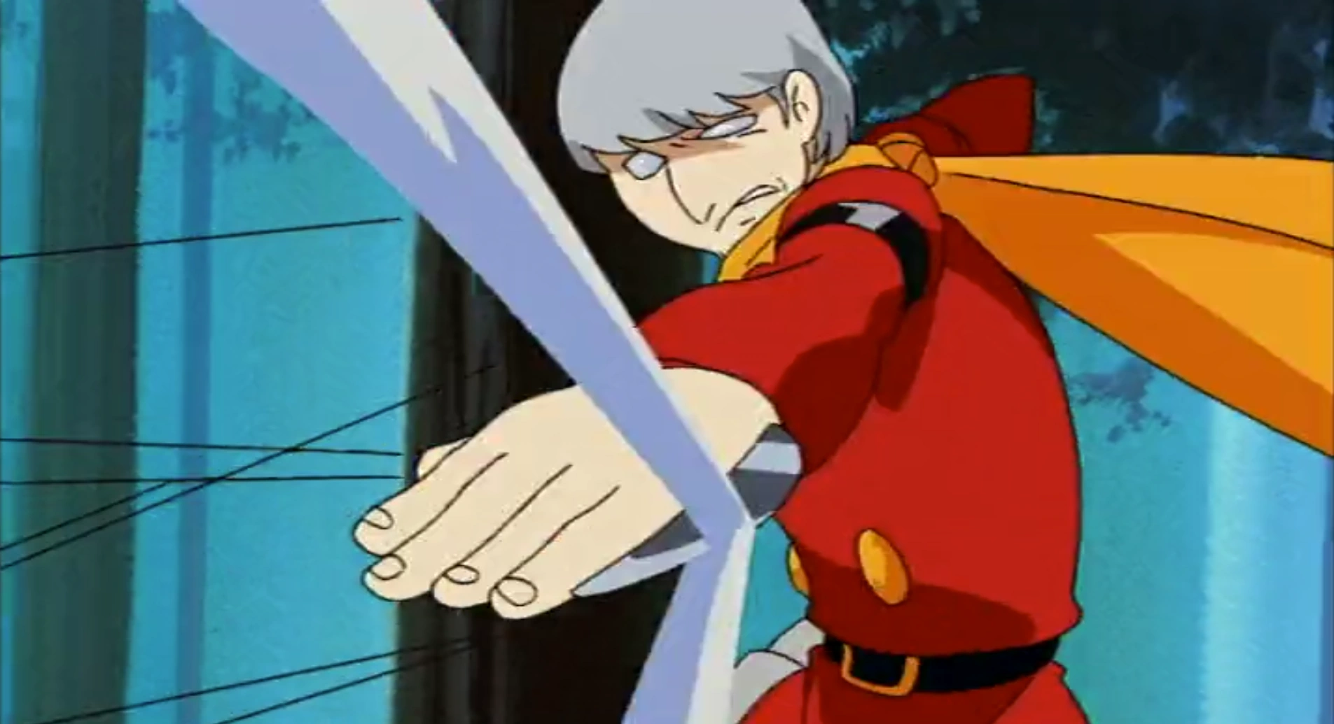 He usually wears a red, double breasted military uniform worn by the 00 Cyborgs, with padded shoulders and black arm bands just beneath them. On his waist is a black belt with a holster for his weapon, a gun with three shooting modes.
